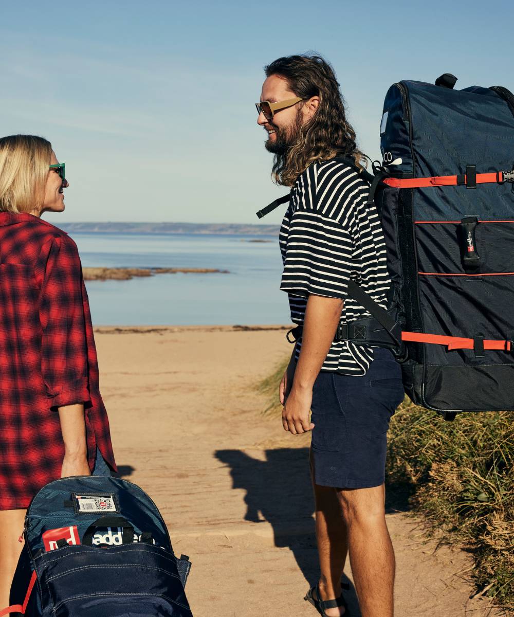 The package includes a large, spacious wheeled backpack. It features wide shoulder straps and a reinforced back panel, allowing for comfortable carrying even when transporting the board to more remote locations.